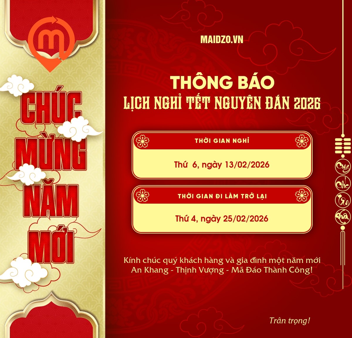 MAIDZO thông báo đến Quý Khách hàng lịch ngừng tiếp nhận đơn đặt hàng và ký gửi hàng hóa Trung Quốc trước Tết Nguyên Đán 2026 như sau: